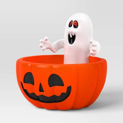 Serve candy to trick-or-treaters in fun seasonal style with this 10.63-Inch Light and Sound Ghosty Candy Bowl Halloween Decorative Prop from Hyde and EEK! Boutiqueâ„¢. Made from plastic, this prop showcases a white ghost springing out from an orange candy bowl featuring a black jack-o’-lantern face. Boasting a light-up design, this battery-powered bowl plays one song for added effect.