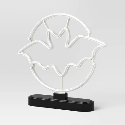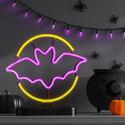 Impress all the trick-or-treaters on the scariest night of the year with the Lit Neon Moon and Bat Halloween Decorative Prop from Hyde and EEK! Boutiqueâ„¢. The decorative prop features a neon yellow moon with pink bat on the inside and a rectangular stable base. The prop also lights up with the included batteries to add an eerie glow to your display.