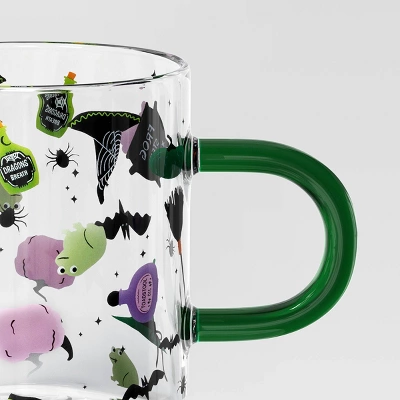 Sip your morning coffee or evening tea in haunting style with the Glass Bat and Witch Hat Print Mug from Hyde and EEK! Boutiqueâ„¢. This printed mug is covered with bats, witches, frogs and more on a clear backdrop for classic Halloween vibes. Made of glass, this clear mug can be used to serve both hot and cold beverages and is microwave safe for easy reheating.
