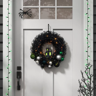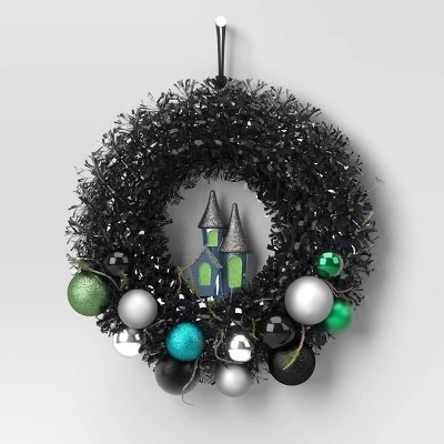 - Back witchy wreath with a glittery haunted house and ball ornaments