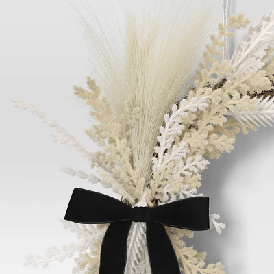 Bring creepy-cute flair to your Halloween decorations with this Artificial Moon Wreath from Hyde and EEK! Boutiqueâ„¢. The artificial moon wreath is covered with beige grasses and stems plus a black bow-tie hanging in the middle to add a fun, festive finish to any space. Suitable for indoor use, the artificial wreath looks wonderful above the mantel or on a door and requires no upkeep.