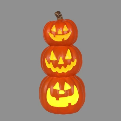 Add a glowing stack of pumpkins to your seasonal decor with the Lit Triple-Stacked Pumpkin Halloween Decorative Prop from Hyde and EEK! Boutiqueâ„¢. This decorative prop showcases varying-sized jack-o’-lanterns stacked atop one another for a festive look. Plus, it features a timer to allow you to customize the lighting time. Great for both indoor and sheltered outdoor use, this light-up decorative prop requires 3 LR44 alkaline batteries for operation.