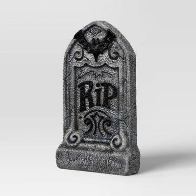 - Gray tombstone with black bat and “RIP” text