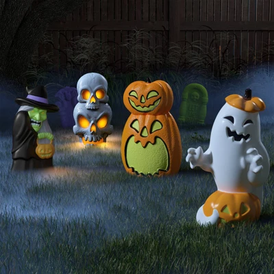 These Halloween Light and Sound Stacked Lit Figural Skulls from Hyde and EEK! Boutiqueâ„¢ are perfect for creating a chilling atmosphere. Made of plastic, this Halloween prop features two white stacked skulls in graduated sizes, which light up and make creepy sounds for extra Halloween fun. Use them on your porch or in your yard to give trick-or-treaters welcoming fright or as part of a haunted house setup.