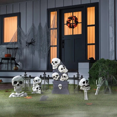 Create a bone-rattling haunted setup in your indoor or outdoor space with this 21.875-Inch Bones Scene Setter Halloween Decorative Prop Kit from Hyde and EEK! Boutiqueâ„¢. Made from polypropylene, this decorative prop kit includes one large skull tombstone, four black spiders, six stakes, four pieces of black fence, one top-half skeleton, one stacked skull, one skull with a head, an arm with a hand, and a white bag of web to let you create a scary graveyard in your own style.