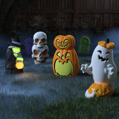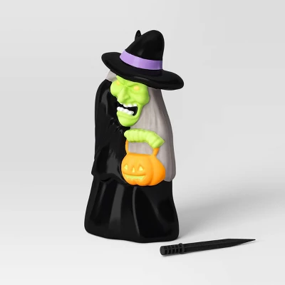 Instantly add creepy style to your outdoor Halloween decor with this Light and Sound Witch Outdoor Halloween Decorative Prop from Hyde and EEK! Boutiqueâ„¢. This witch decorative prop comes to life with noise and light when activated by sound. Featuring a laughing witch holding a lighted jack-o’-lantern, this prop plays sounds when activated.