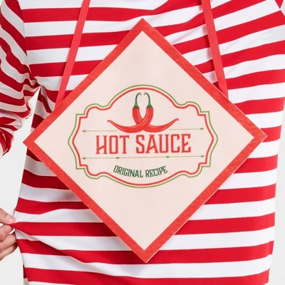 Spice up your costume with this Hot Sauce Costume Accessories Kit from Hyde and EEK! Boutiqueâ„¢. This two-piece wearable accessory set includes a typographic overlay tag in red, green and off-white with the text “Hot Sauce, Original Recipe” and two red chili peppers, paired with a red-and-green hat with the white-lettered label “Red Pepper” to turn up the heat at your Halloween bash.