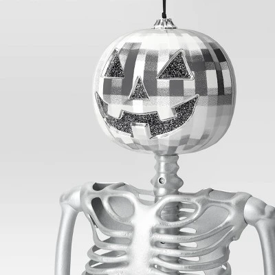 Crank up the creepy factor on your Halloween festivities with this Poseable Pumpkin Skeleton With Disco Jack Head Halloween Decorative Prop from Hyde and EEK! Boutiqueâ„¢. The Halloween decorative prop features a poseable disco jack head pumpkin skeleton in a silver finish to create a fun, creepy vibe, and the loop attached in the middle allows for easy placement. Made from polypropylene material, this skeleton prop is suitable for indoor and outdoor use. Display it near the front door, on your porch, at the office or inside your home to give your family, friends, and neighbors a fun scare.