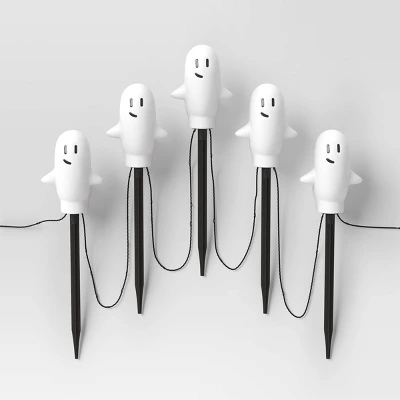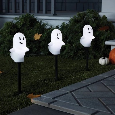 Bring a scary update to your Halloween decor with these 5-Count LED Ghost Pathway Lights with Chasing Light Effect and Timer from Hyde and EEK! Boutiqueâ„¢. These Halloween pathway lights showcase LED cool white ghosts designed with a chasing light effect and a timer to cast a scary-festive glow that completes your outdoor display. It includes black ground stakes for an easy and secure display. Place them along a walkway or in your yard to light up the night.