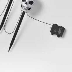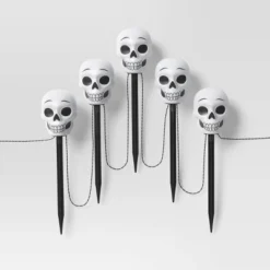 Your Halloween decor will be the talk of the town with these 5-Count LED Skull Pathway Lights with Timer from Hyde and EEK! Boutiqueâ„¢. These Halloween pathway lights showcase LED cool white skulls designed with a timer to cast a scary-festive glow that completes your outdoor display. It includes black ground stakes for an easy and secure display. Place them along a walkway or in your yard to light up the night.