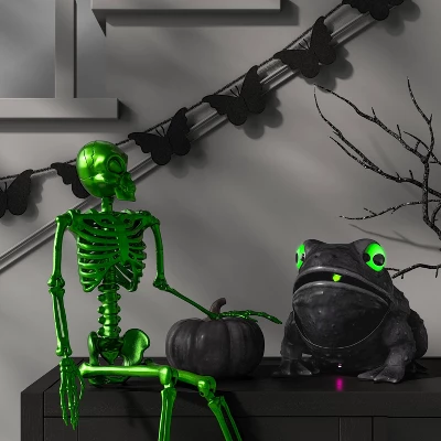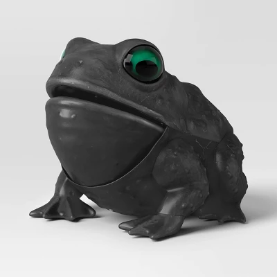Liven up your seasonal decor with this Talking and Singing Toad Halloween Decorative Prop from Hyde and EEK! Boutiqueâ„¢. This Halloween prop features a sitting black toad with colorful bulbs that lights up with the included 3 AA batteries. Boasting a sound sensor, this toad talks and sings, adding a whimsical touch to your Halloween display.