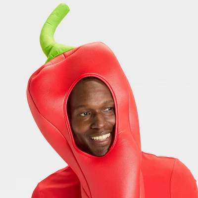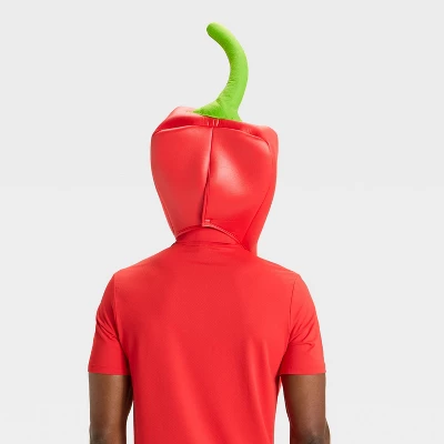 Style a red-hot Halloween costume with this Adult Accessories Chili Pepper Mask from Hyde and EEK! Boutiqueâ„¢. This bright-red mask shaped like a chili pepper is made of polyester and has an opening for the wearer’s face. Wear it with matching red clothes to spice up your Halloween festivities.