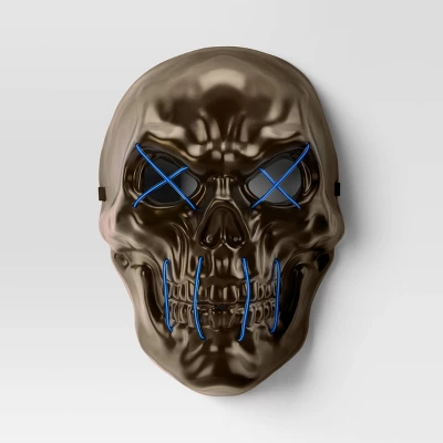 This Adult Accessories Light-Up Grim Skull Mask from Hyde and EEK! Boutiqueâ„¢ makes a fun addition to a variety of creepy costumes. Sized for adults, this mask is designed in a grim skull shape in black with neon blue light-up accents. It features eye, nose and mouth openings and requires two AA alkaline batteries (included).