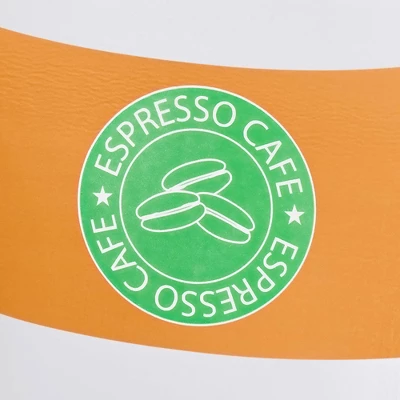 - Orange and white takeout coffee cup with “Espresso Cafe” text