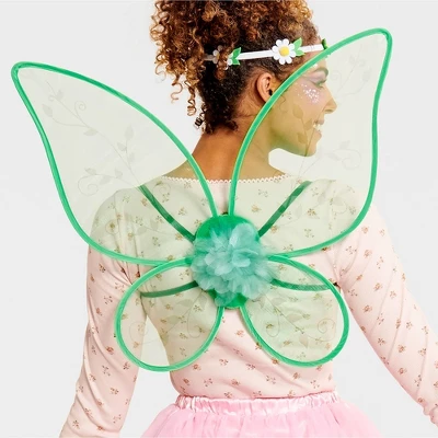 Transform into a mystical fairy with this Garden Fairy Halloween Costume Accessory Kit from Hyde and EEK! Boutiqueâ„¢. Made of polyester, this costume kit includes a light pink tutu, delicate wings in light green and a floral crown, helping to add a sprinkle of nature’s magic to your Halloween look. Complete the costume with a top-knot bun, light pink leggings, glittery ballet flats and a wand.