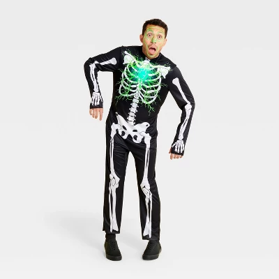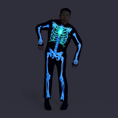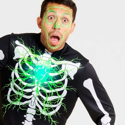 Take on Halloween night in classic style with this Light-Up Electric Bones Skeleton Costume Glows Under Blacklight from Hyde and EEK! Boutiqueâ„¢. Made from 100% polyester, this Halloween costume features a black jumpsuit with long sleeves, adorned with white-and-green bones that light up eerie green. Complete your look with green face makeup and black boots. Glows under blacklight.