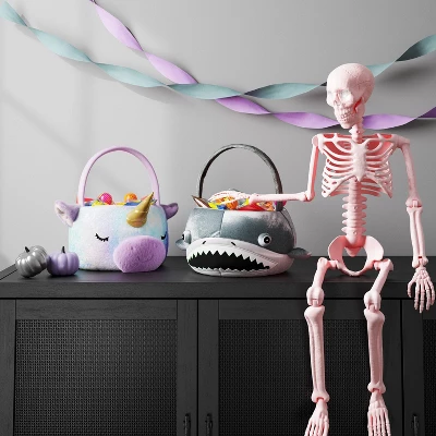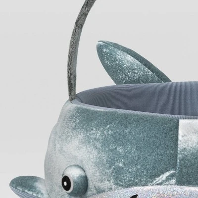 Add a fin-tastic touch to your festivities with this Halloween Shark Round Polyester Trick-or-Treat Decorative Bling Basket from Hyde and EEK! Boutiqueâ„¢. This round basket is accented with a shark design in glitter teal with silver-color accents and features a cute shark design complete with white jaws, globular eyes, and triangular fins. Made of polyester, the decorative basket has a matching fuzzy handle for easy carrying and is great for collecting and handing out candy while trick-or-treating. Plus, it serves as a seasonal accent for your mantel, entryway, shelf, or table.