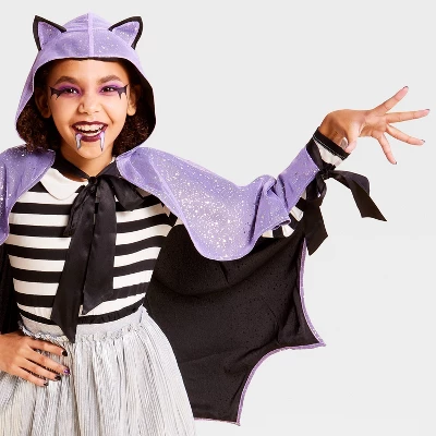 Transform your kind into a creepy-cool creature of the night with this Caplet Bat Cape With Hood and Ears Costume Tunic from Hyde and EEK! Boutiqueâ„¢. This easy-to-wear capelet is designed with a purple-glitter outer surface and black inside with scalloped edges. It features a hooded neckline with pointy ears projecting above, and comes with tie straps for easy fitting around their neck and wrists. Suitable for eight years, the bat capelet brings their winged costume to life while serving as a trusty sidekick for trick-or-treating or playtime.