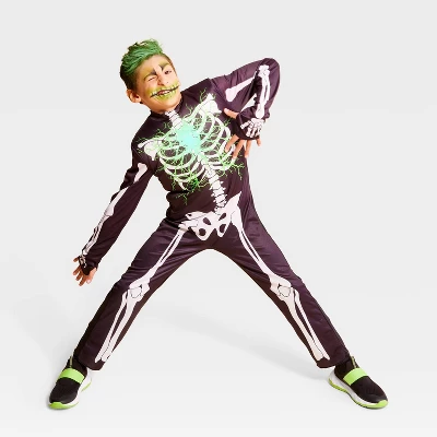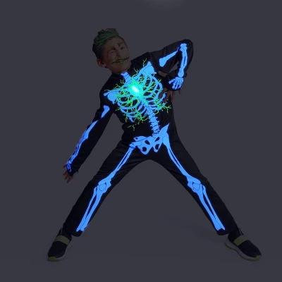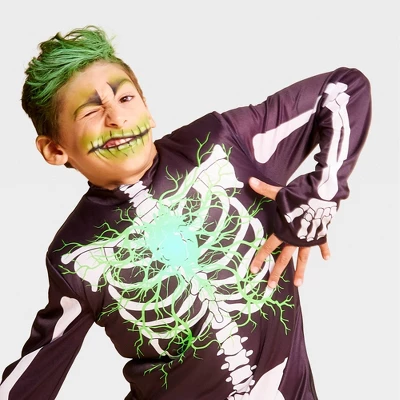Your kid will have a glowing good time on Halloween night in this Kids’ Costumes Light-Up Electric Bones Skeleton Glows Under Blacklight from Hyde and EEK! Boutiqueâ„¢. This costume features a black and white polyester skeleton jumpsuit with green electric accents. The bones glow in the dark, and the center of the chest also lights up green with the help of three LR44 alkaline batteries (included) for extra fun. Also glows under blacklight.