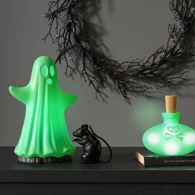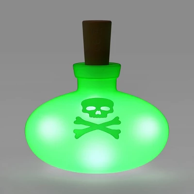 Add a fun glow to your festive occasion with this Lit Plastic Bottle Skull Figurine from Hyde and EEK! Boutiqueâ„¢. This plastic bottle figurine stands 4.3 inches tall and features engraved skull detailing on the front for an eerie display. With its battery-operated design, you can display this neon green lit bottle figurine anywhere in your home to enhance your eerie Halloween decor. It also glows when placed under a black light.