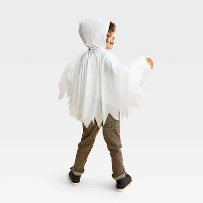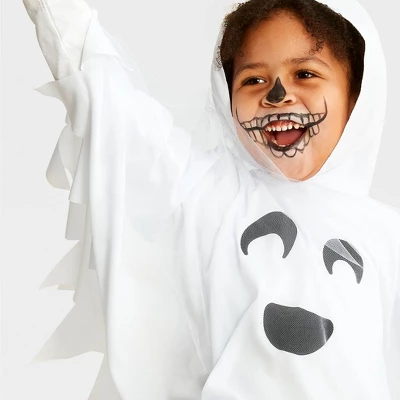 Dress your little one in a fun, spectral costume with the Toddler Ghost Halloween Costume Cape from Hyde and EEK! Boutiqueâ„¢. This toddler costume cape is crafted in a white hue, featuring mesh detailing, a distinct hem with triangular edges, an attached hood, and a smiling ghost face adorning the front. Instantly elevating their Halloween experience, this hooded cape is perfect for trick-or-treating, themed parties, photo ops and more.