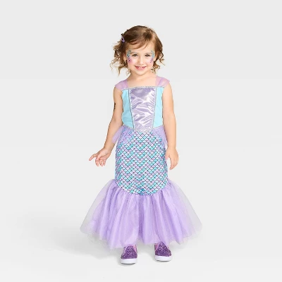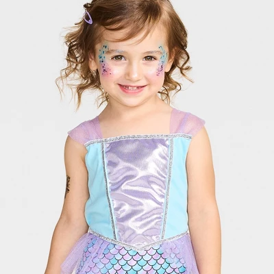 Give your toddler a fairy-tale makeover this Halloween by dressing them up with this Magical Mermaid Costume Dress from Hyde and EEK! Boutiqueâ„¢. This pullover dress has a sleeveless bodice with shimmery highlights and a mermaid-scale print skirt in soft aqua blue and purple hues, adorned with purple mesh accents on the waist and hem for added flair. Complete their look with mermaid face makeup and glittery shoes.