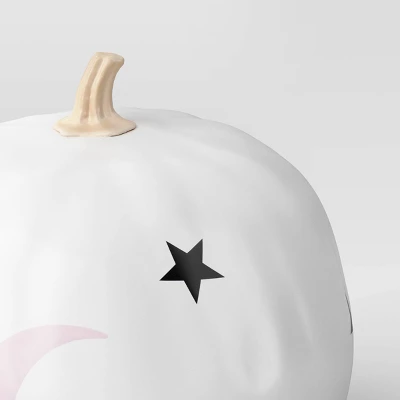 Bring festive magic to your decor with this Wonder-Painted Pumpkin Moon & Star Figurine from Hyde and EEK! Boutiqueâ„¢. This decorative pumpkin figurine features a pink crescent moon and black stars against a white backdrop, creating a celebratory look. This foam pumpkin is suitable for indoor use and is great for Halloween or fall festivities. Place it solo on your mantel, windowsill, bookshelf, coffee table, or entryway table, or pair it with other Halloween or fall props for an elevated seasonal spirit.
